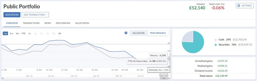 Moving on, November has started well, might we be at the start of a new up trend in the markets? No Phil, don’t get too excited. Though I think there is a chance that we are, as it looks like peak interest rates may be in. Add to that a lot of stocks are at incredibly cheap valuations, especially in the UK and I’m not sure there’s much downward pressure left. Anyway it will be whatever it is, I’ll be here when the next bull run starts. Having only started investing in individual stocks in 2020 all of these market cycles are new to me, so it’s very much a time to learn and not make too many, if any, assumptions. If I can close out the year with a positive return for the portfolio I think I’ll be happy, it’s been a difficult year, especially in the UK, which seems to be out of favour with many investors.
