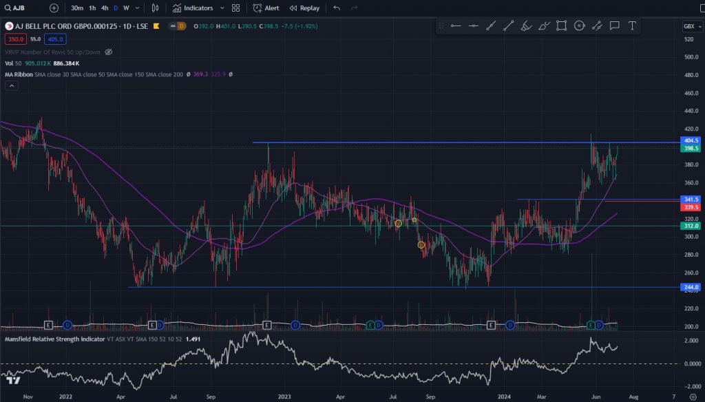 AJ Bell (AJB) – I already have a position, though not a full one. Setting up nicely to take out previous long term highs. Could see a big break, though would want to see decent volume come in to add to my existing position.