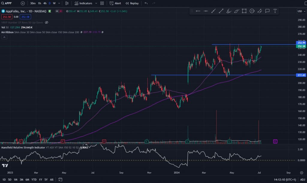 AppFolio (APPF) – not the best set up as still really in a strong up trend and quite a wide channel. Though could be a good entry if it breaks with decent volume, especially with a catalyst such as good earnings.