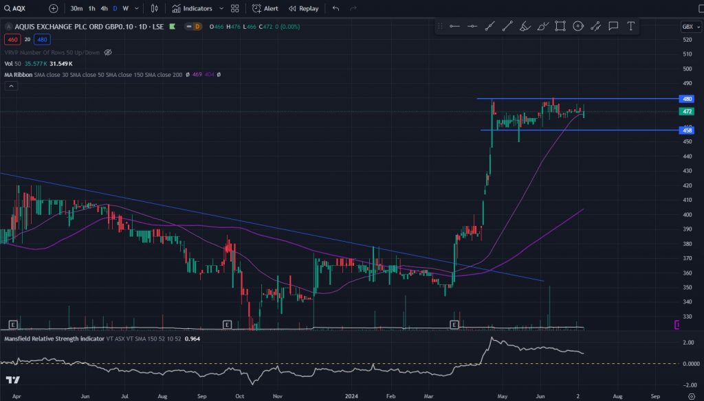 Aquis Exchange (AQX) – Continues to set up really well in a very tight sideways channel. I’m not actually expecting this to go this week, unless there’s some news, but one to keep an eye on until it breaks one way or the other.