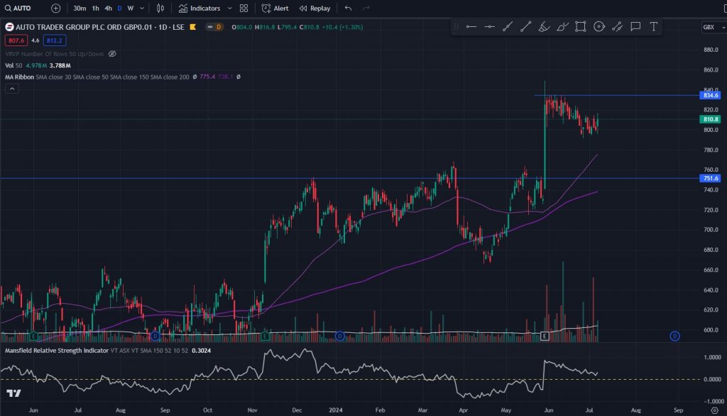Auto Trader (AUTO) – Not ideal as the optimal entry was the breakout on 30th May, or back in November. However it is putting in a sideways channel. Ideally I want to see this continue for another couple of months. But one to consider if it breaks with volume sooner.