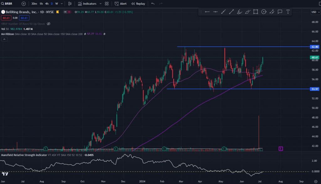 BellRing Brands (BRBR) – Still in it’s sideways channel & heading back up to the top. I think it will need the next earnings to break out, but you never know.