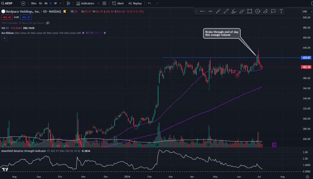 Medpace Holdings (MEDP) – Still in it’s sideways channel. Had a go at breaking out recently, though failed on low volume. The 150MA is coming up to meet the price, I can see it going one way or the other in the next 2-3 weeks.