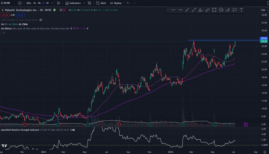 Palantir (PLTR) – Similar to AppFolio in that it’s not perfect as it hasn’t had much of a correction. However it has put in some sideways movement and fell right back to the 150MA. Needs to be a strong break, but certainly a tradable opportunity.