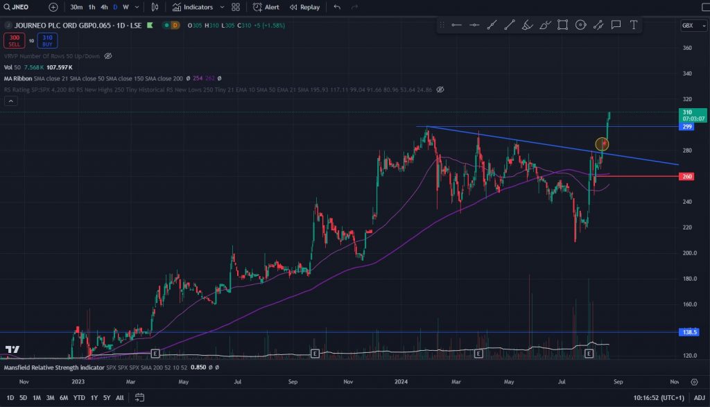 Another that I entered recently as it broke through a trend line. There was another entry opportunity when it broke through horizontal resistance. I’m looking to add to this position fairly soon & will be looking to do so on either a re test of the 300p level or a breakthrough after a period of sideways action.